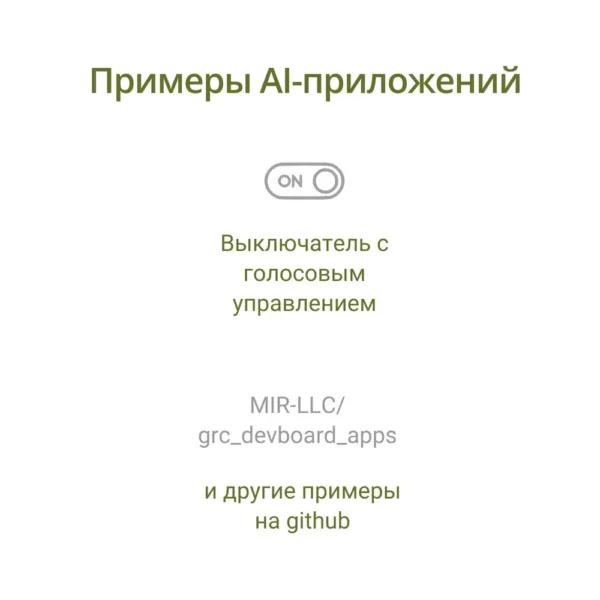 Примеры приложений на github (MIR-LLC/grc_devboard_apps), которые вы можете адаптировать и использовать в разработке собственных AI-устройств.