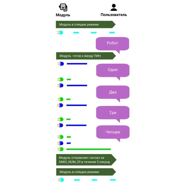 По команде Робот, модуль просыпается, дает сигнал светодиодом, и ждет произнесение ПИН.